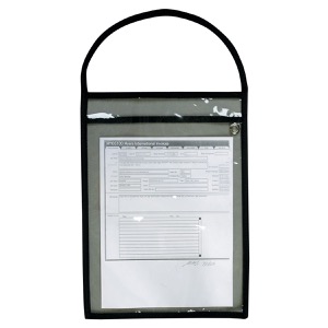 Slip-N-Grip work ticket holders feature a clear plastic front and back with a nylon handle and brass grommet.
